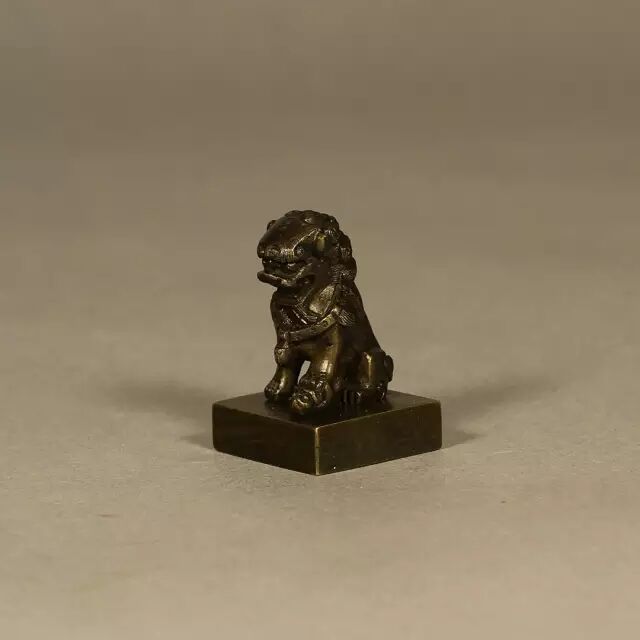 说明: 狮钮形象生动,双目圆睁,作怒吼状,鬃毛、四肢盘曲,正坐于底部之上。神态生动可爱又不失威武之势。印章以铜制作.