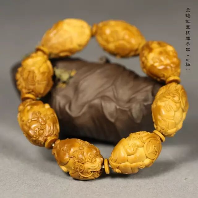 作品介绍:此件核雕雕工精细,把每一粒都雕成树桩造型,每粒树桩上都趴有一只金龟,寓意富甲天下。
