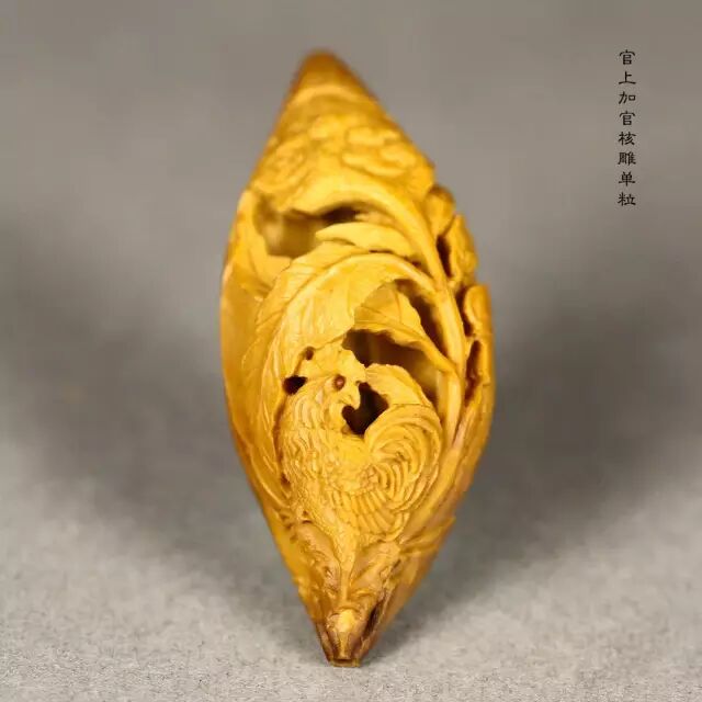 作品介绍:此款核雕雕刻雄鸡,雄鸡鸡冠高耸、表示能得官。因此以一只有着漂亮鸡冠的雄鸡为赠礼,表示祝贺对方能够获得官职,用来祝贺“官上加官”。