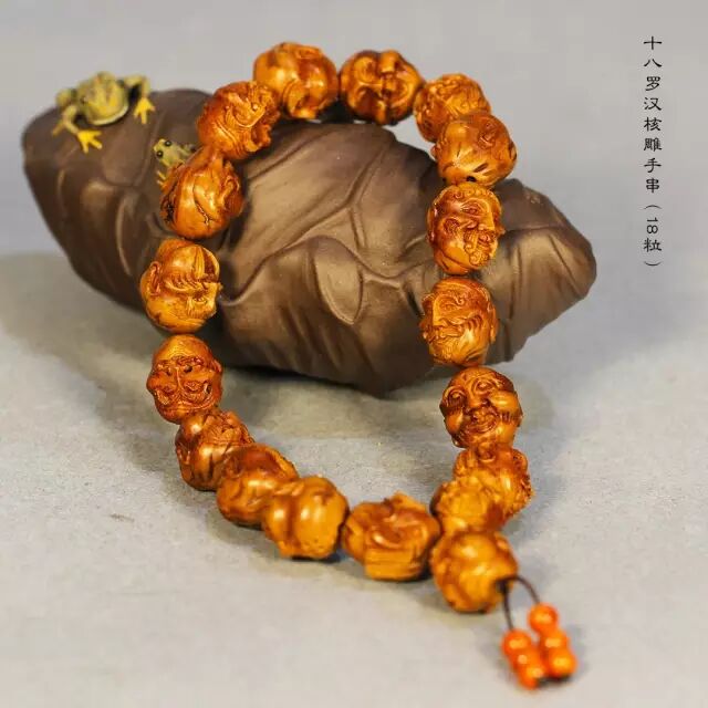 作品介绍:十八罗汉脸谱无一重复,表情生动、喜怒哀乐俱全。神态各异,惟妙惟肖,呼之欲出。在核雕题材中,十八罗汉并不少见。但是在该件作品中,将十八个罗