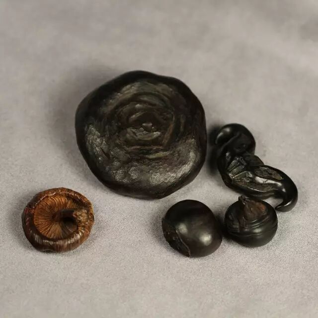 作品介绍:此五件物品以珍稀紫檀木料雕柿饼、香菇、荸荠、菱、栗子形状,雕工精细,栩栩如生,是作为饮茶品茗时不可多得的把玩之物。