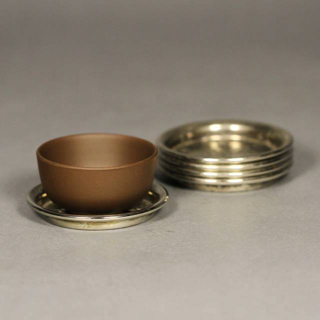 作品介绍:此件茶丞材质为银合金,内部布满工捶打之系目纹,造型简单、精巧,放以茶席之间乃绝配。