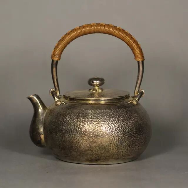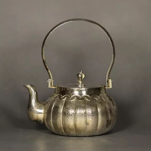 作品介绍:银壶为瓜棱形,壶盖平滑,壶身布满槌目纹,产生非同一般的光影效果,瓜棱的凹凸使得色彩变幻绚丽,令人品位其中的视觉享受。