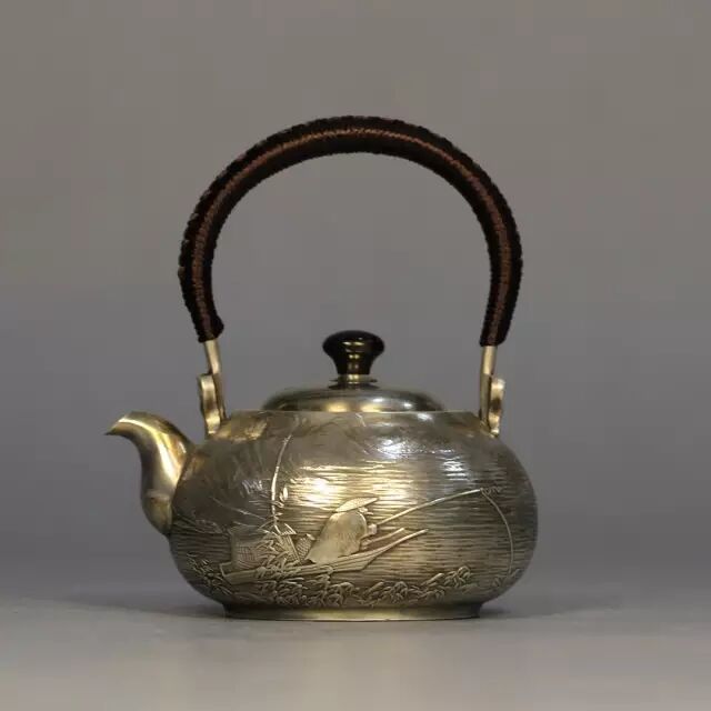 作品介绍:壶银质,壶盖平滑,壶身雕人物、渔船等,造型敦厚大方,悠然自得之感油然而生。