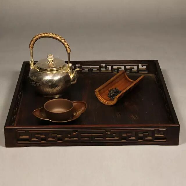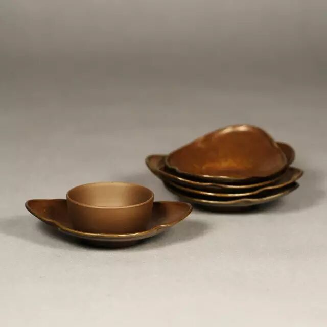 作品介绍:一般的作品大多有纹饰,这套茶丞以铜为料是难得的素器,只布满工捶打之系目纹,用以茶席,必能尽显茶道之风流。