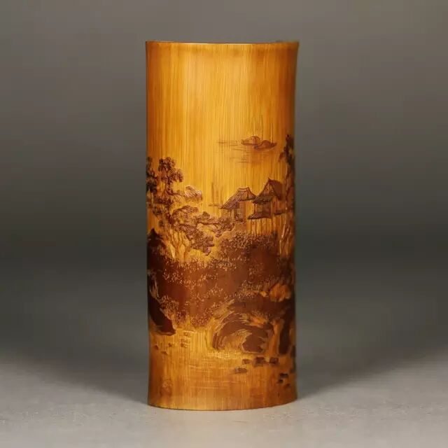 作品介绍:留青竹刻又名皮雕,是以竹外皮的竹筠为花纹图案、以竹肌肤为底的一种极浅薄的雕刻技法。此件作品利用质地与色泽的差异,雕山水河流,有形有色格外美观,又集实用和欣赏于一体,特别具有收藏价值。